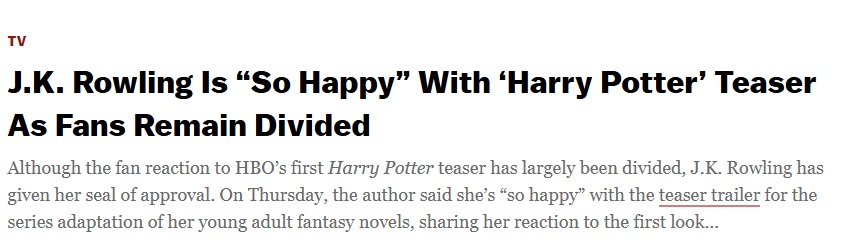And I feel the same way when it comes to the upcoming HBO Max series Harry Potter And The Philosopher’s Stone. The streamer has gone to great lengths to distance itself from J.K. Rowling, but the series is based on her books and she will making a substantial amount of money from the project.