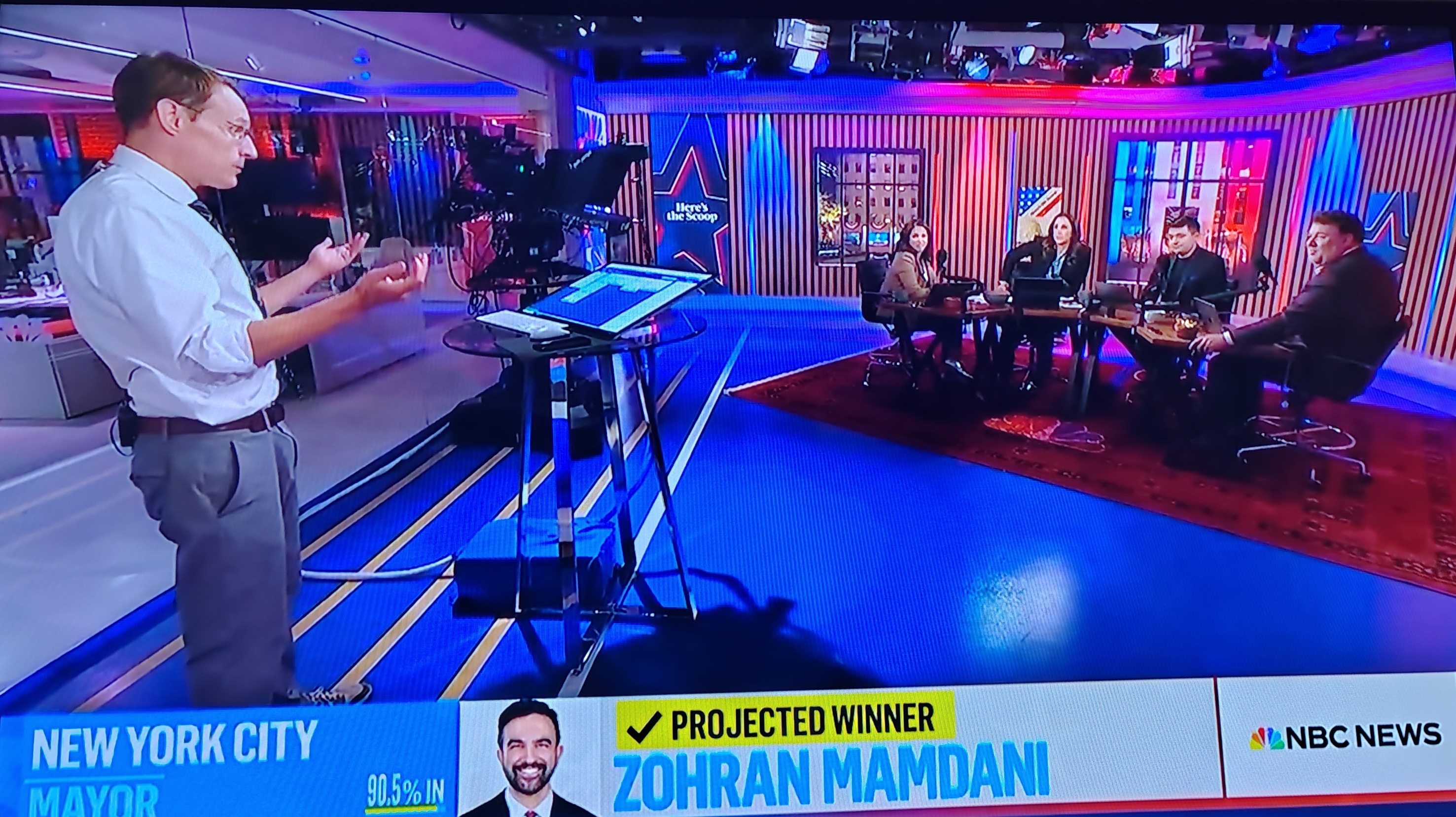 The NBC News Now coverage started off slowly. The first hour was anchored by Tom Llamas, and it was a very safe, standard presentation. There was a segment with a panel of partisan strategists bickering and interviews where Llamas leaned into conventional wisdom complaints about Mamdani in a way that felt as if he was reading off a bunch of talking points he needed to get through somehow.